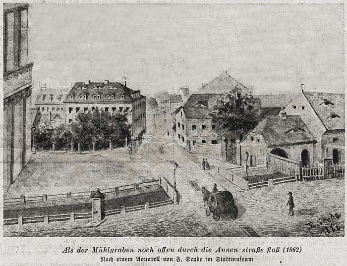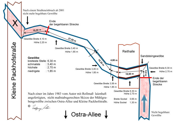 Der kleine Film zeigt das heute noch vor-handene unterirdischen Gewölbe des ehe-maligen Weißeritzmühlgrabens im Gelände der Zwingerbauhütte und der Theaterwerk-stätten an der Ostra-Allee bzw. Packhofstraße, Video aufgenommen 2004 im Auftrag der DREWAG.Siehe auch nebenstehende Handskizze.