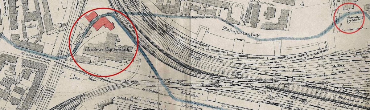 Verlegung bzw. Verlust des Weißeritzmühlgrabens an dieser Stelle durch den Bau des “Central-Güterbahnhofes”