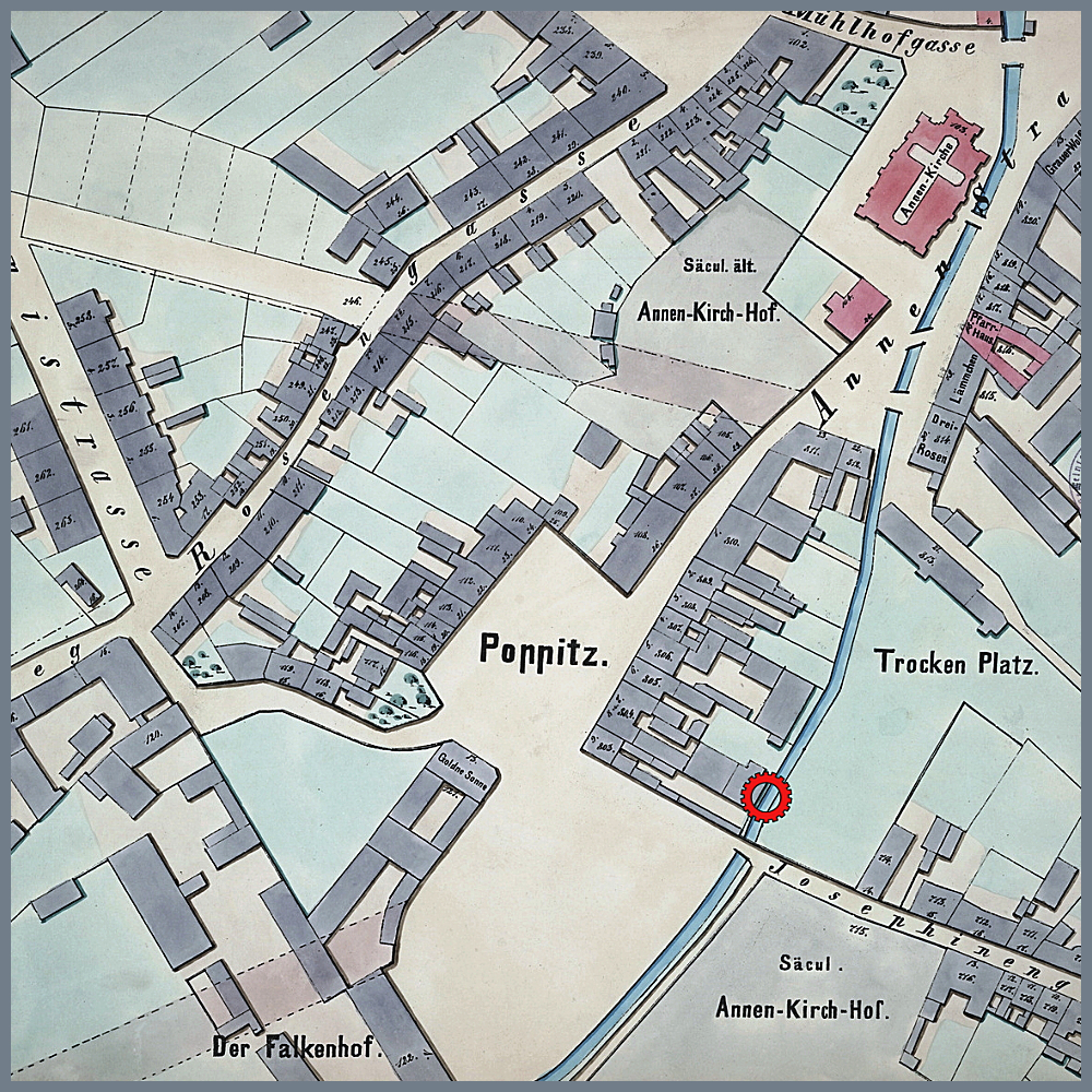 erstmals erwähnt, vermutlicher Standort am Anfang der „Kleinen Plauenschen Gasse“ am „See“